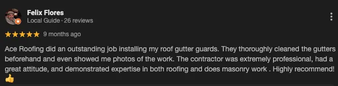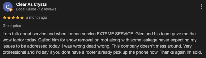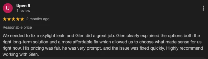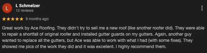 We take pride in our honest and sincere work. We are a very reputable roofing company and we would like to keep it that way. Our prices are extremely fair and transparent. We provide a breakdown of our assessment and price every time.