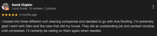 Most asphalt shingle roof replacement projects are completed in 1-3 days. We don't like to rush jobs as we want to be as careful and thorough as possible with our installation and cleanup.